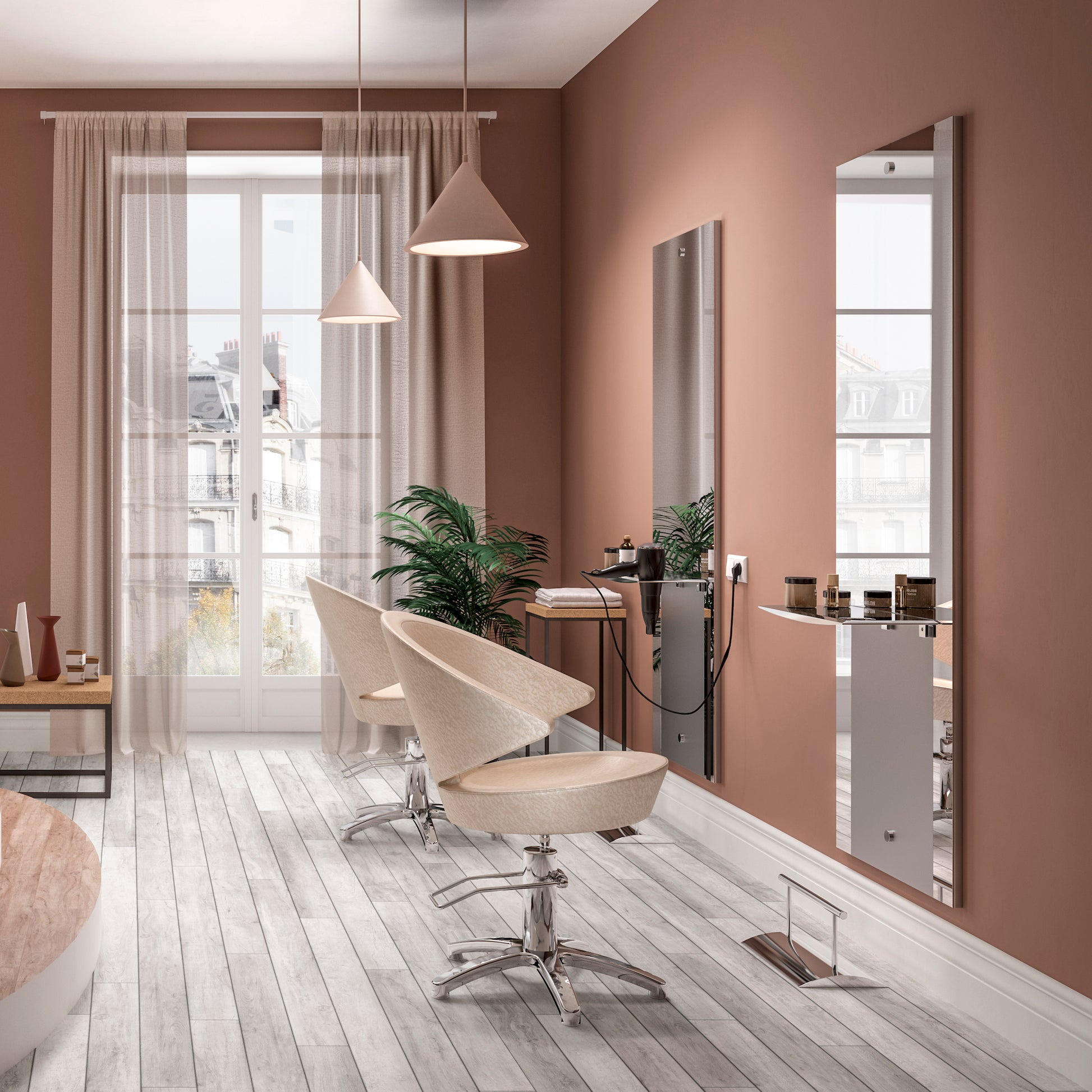 The structure is designed to respect the environment, thanks to energy-saving lights and eco-friendly materials. The best choice for your salon and for the environment.