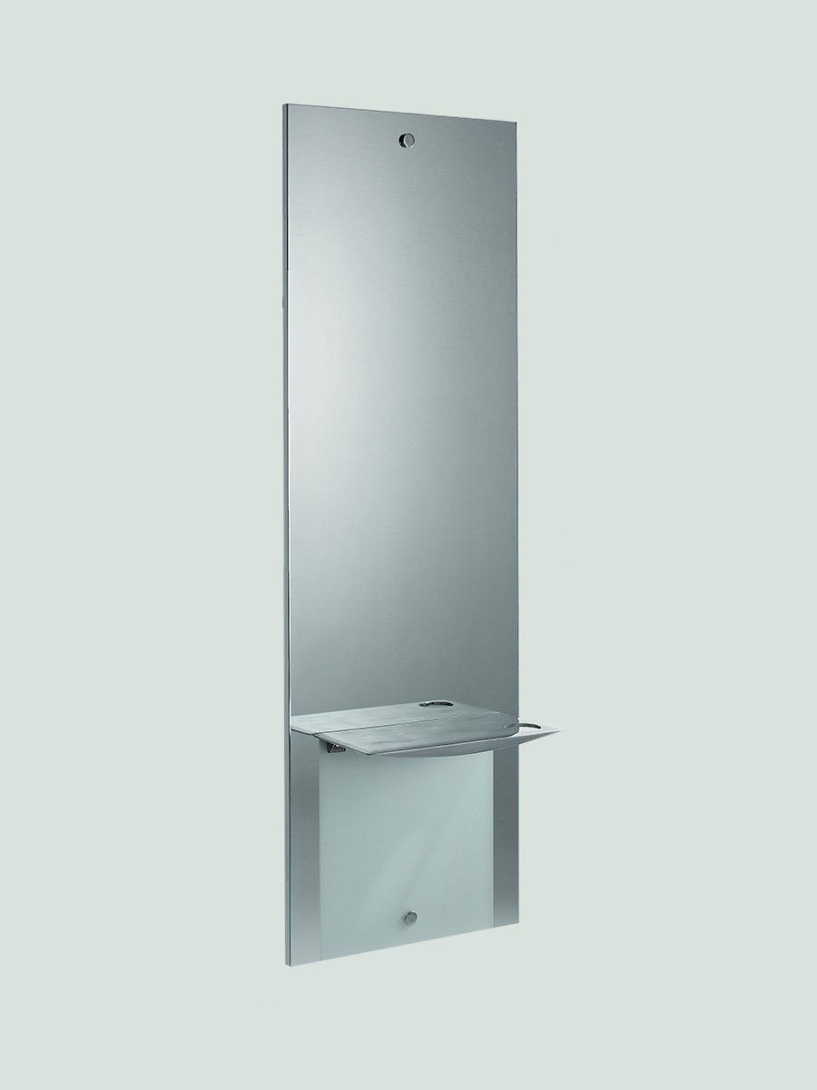 Single place styling unit with metal chromed footrest. Mirror fixed on transparent glass. Rectangular aluminum top with rounded corners.