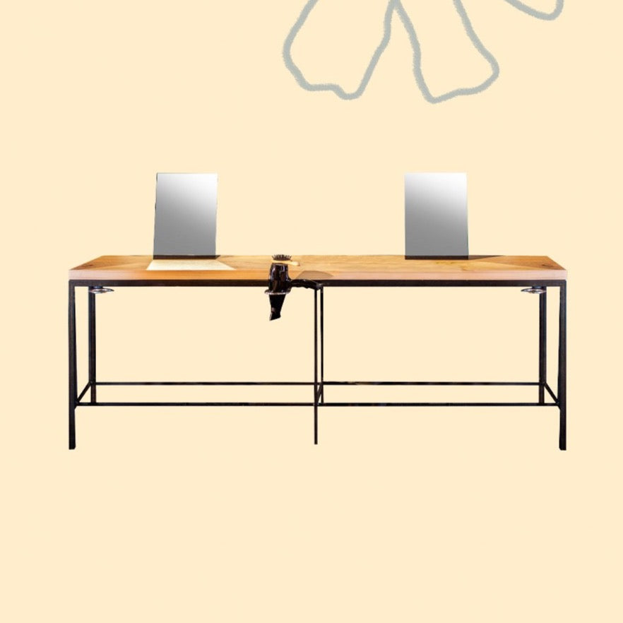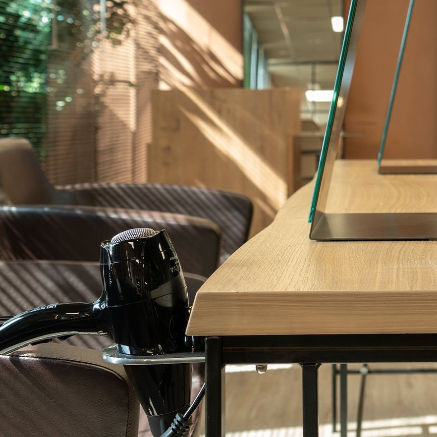 Central technical table. Structure in black painted iron with wooden top. Pull out hairdryer holder incorporated in the table.