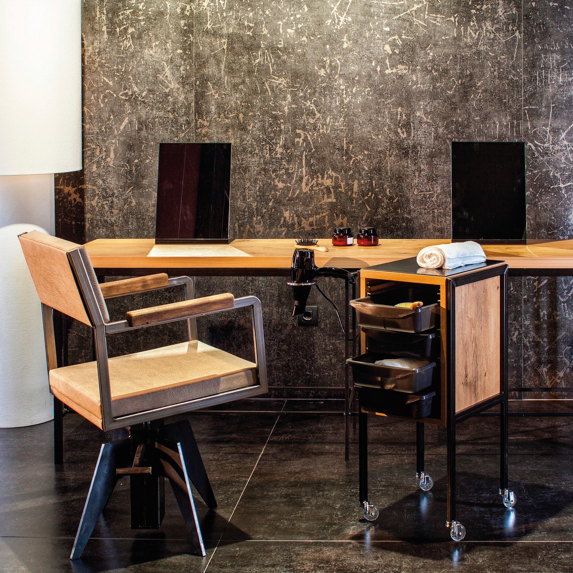 The Bronx technical table consists of an iron frame with a wood-effect laminate top complete with pull-out hairdryer holder. It can be paired with the Manhattan tabletop mirror for a complete set with vintage, retro overtones.