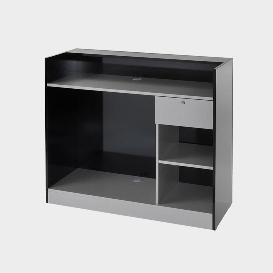 Compact reception desk. Internal structure in ennobled anti-scratch gray. Double work shelf. Keyed drawer and double open compartment. Cable holes and plinth on the ground.