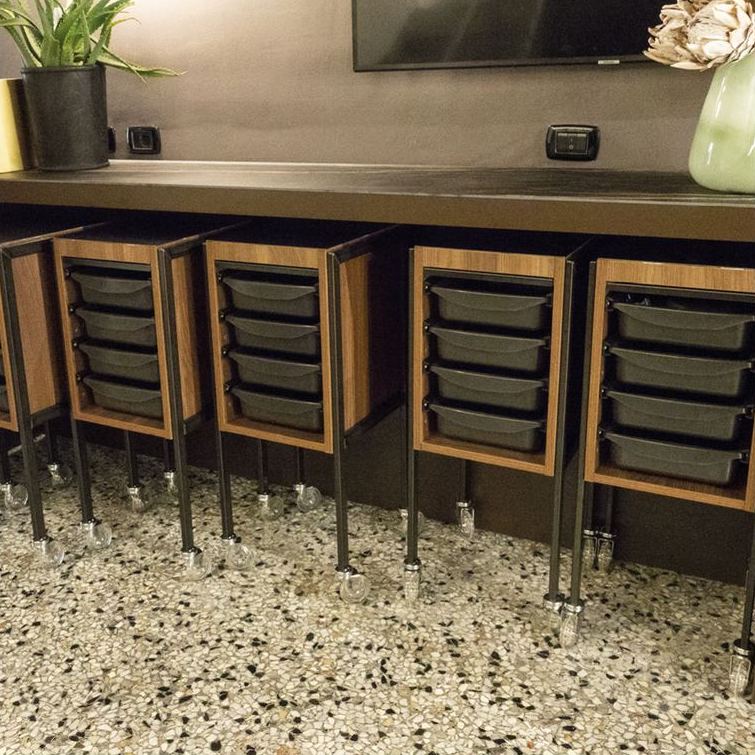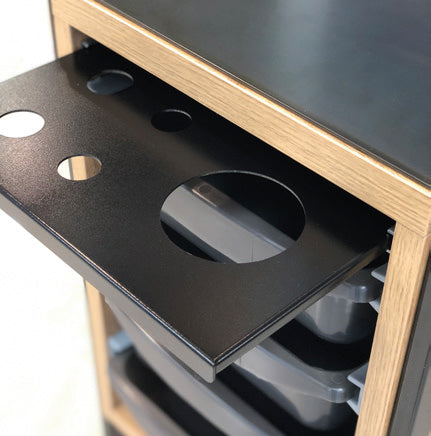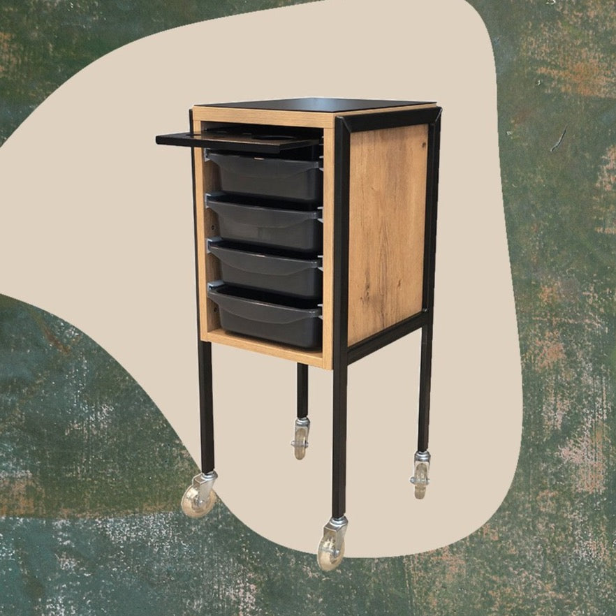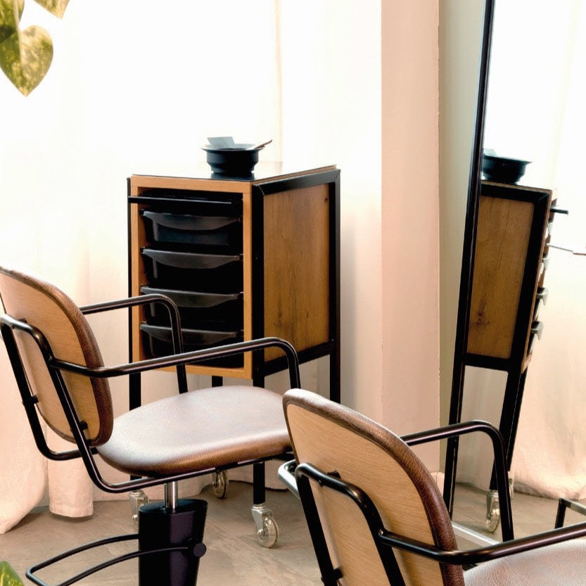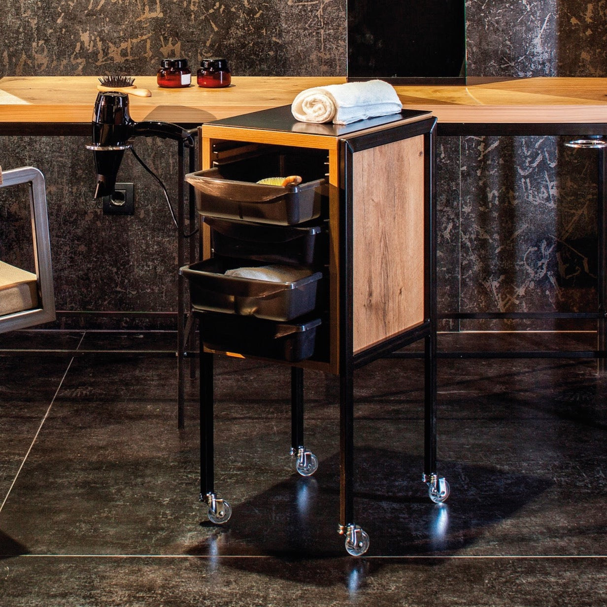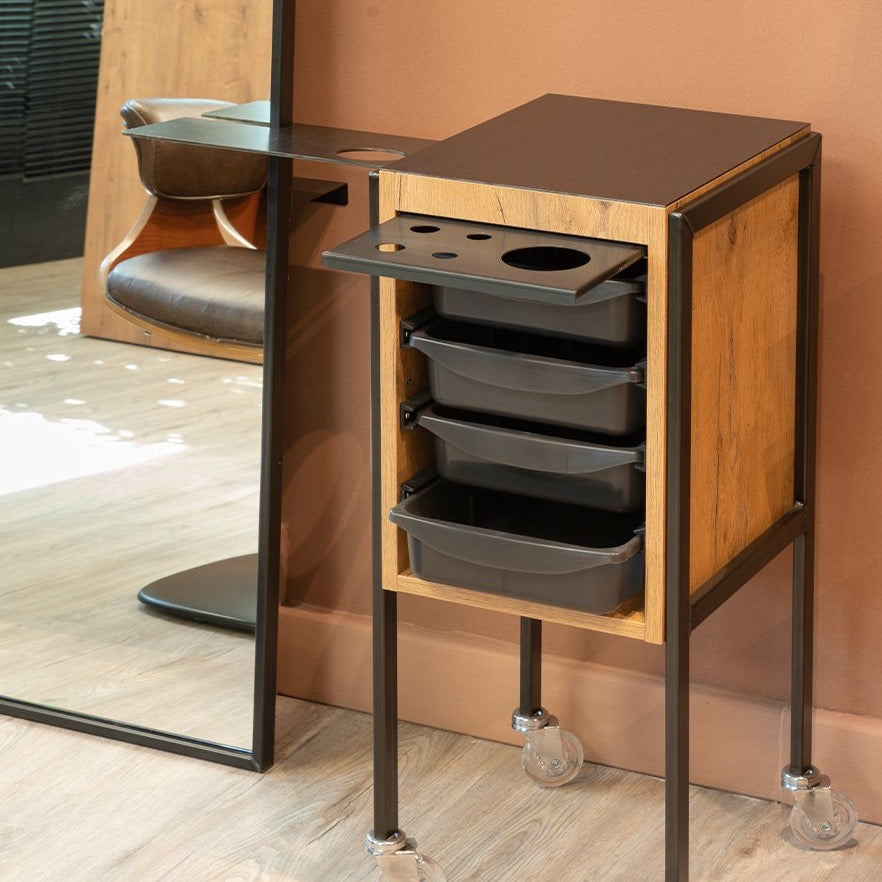 The Coney Island trolley is an essential tool for every professional eager to embrace a green approach without compromising on quality. An accessory that brings an industrial vibe, with its iron and oak-effect laminate structure, designed to be practical and functional as well as stylish.