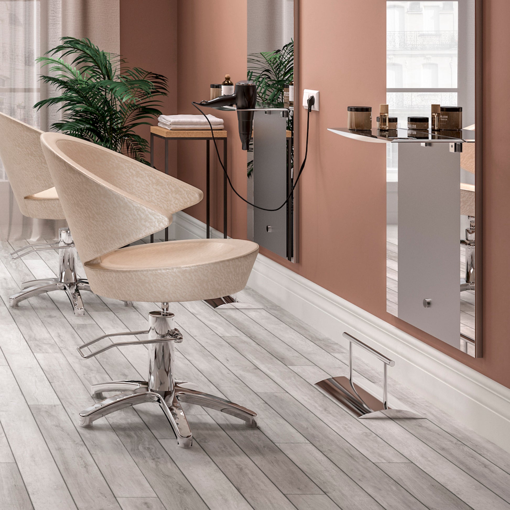 The minimalist design of the Dsplay (Chrome) footrest effortlessly complements any type of salon furnishings and styling chairs, creating a combination with unquestionable aesthetic value. An affordable, eco-sustainable furnishing item of unique quality.