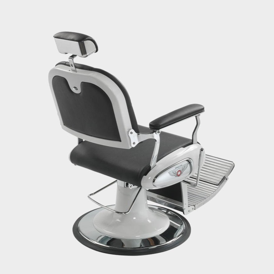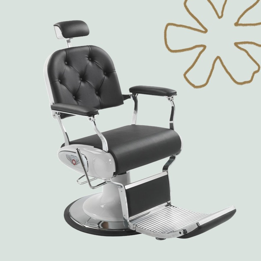This reclining, swivel barber chair features a meticulously crafted structure, skay upholstery and stylish topstitching. The armrests and padded seat offer amazing comfort, further enhanced by the headrest and a footrest complete with tipping tread plate. Metal details add the final touch, making the Elvis Flip barber chair an essential statement piece for every barber shop.