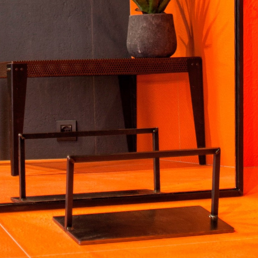 Black painted metal footrest with calamine, visible welding and grinding. Cover in brushed steel.