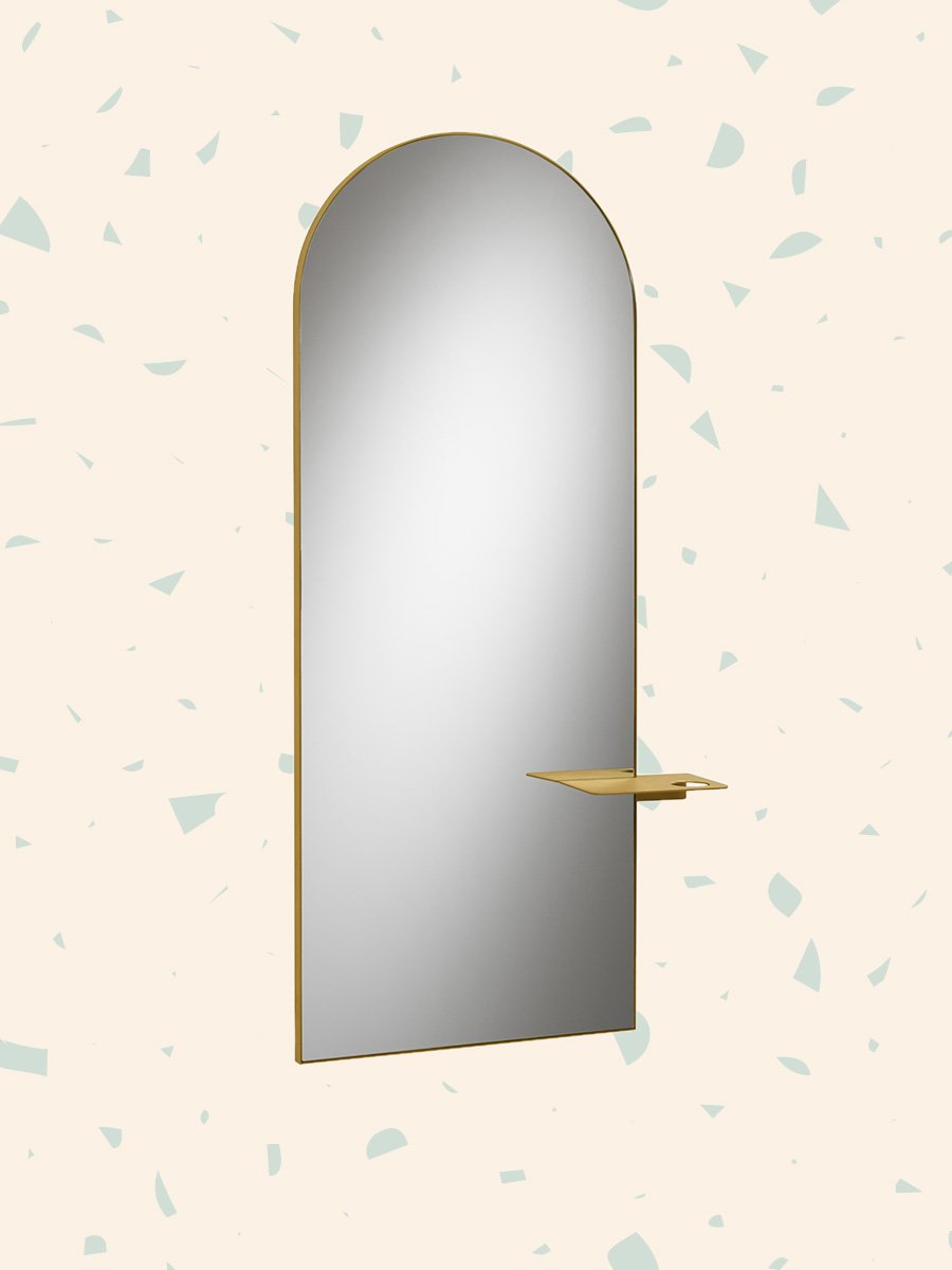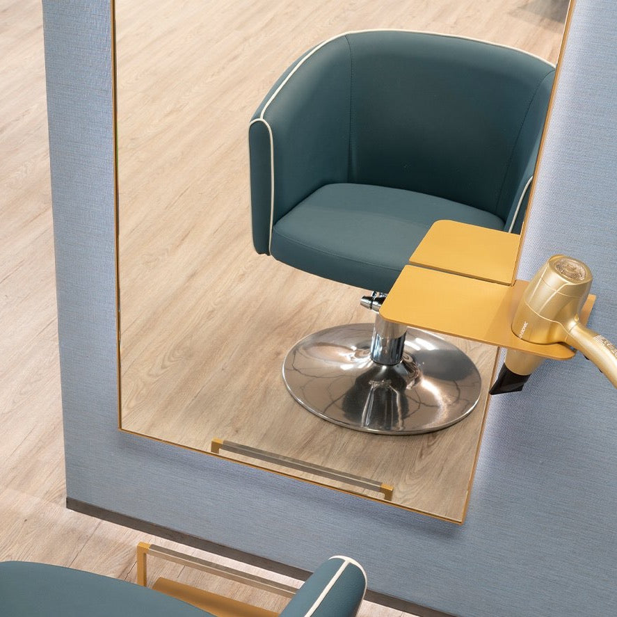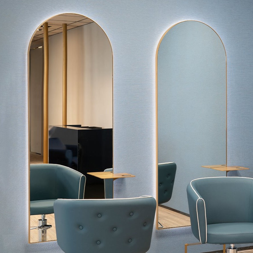 This arched mirror is the perfect choice for professionals, with its refined, unmistakable style enhanced by a slim gold trim around the outside. The product comes complete with a practical gold shelf on the front featuring a hairdryer holder and plug socket.