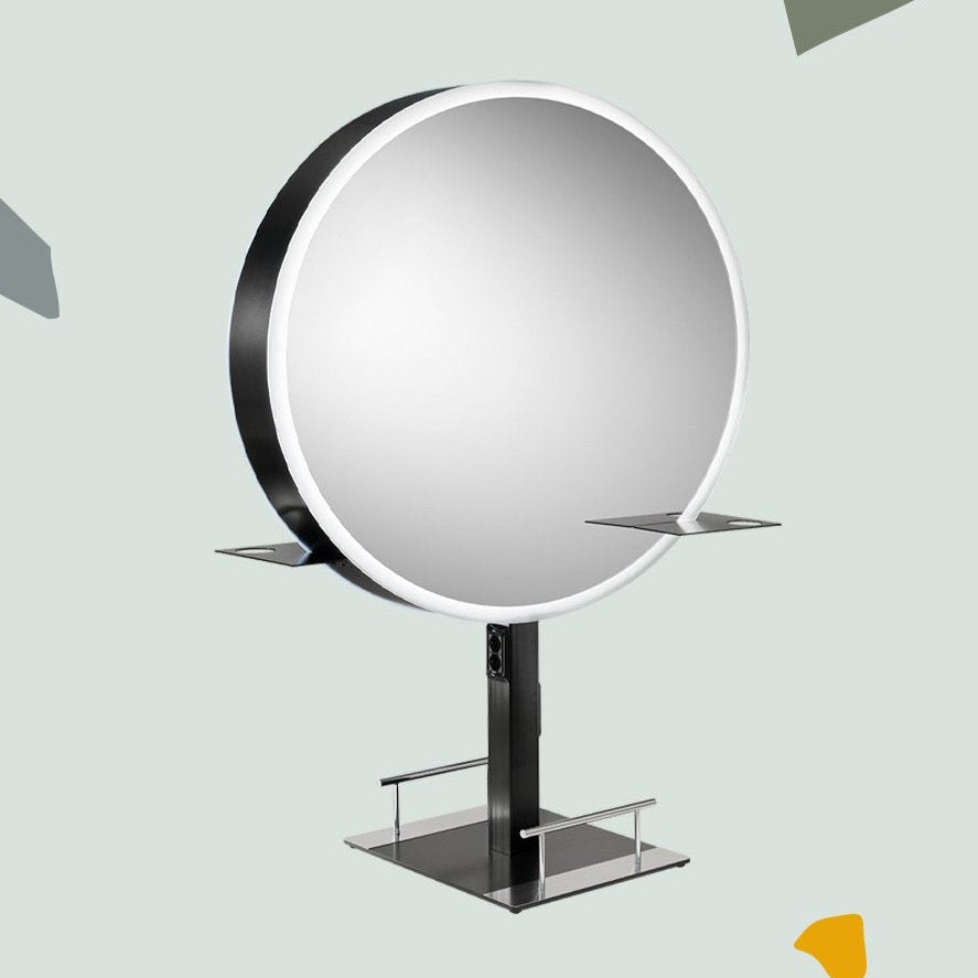 Central Styling Unit self-supporting mirror with LED lighting. Includes hairdryer shelf, metal foot with electrical sockets, built-in footrest and LED illumination.