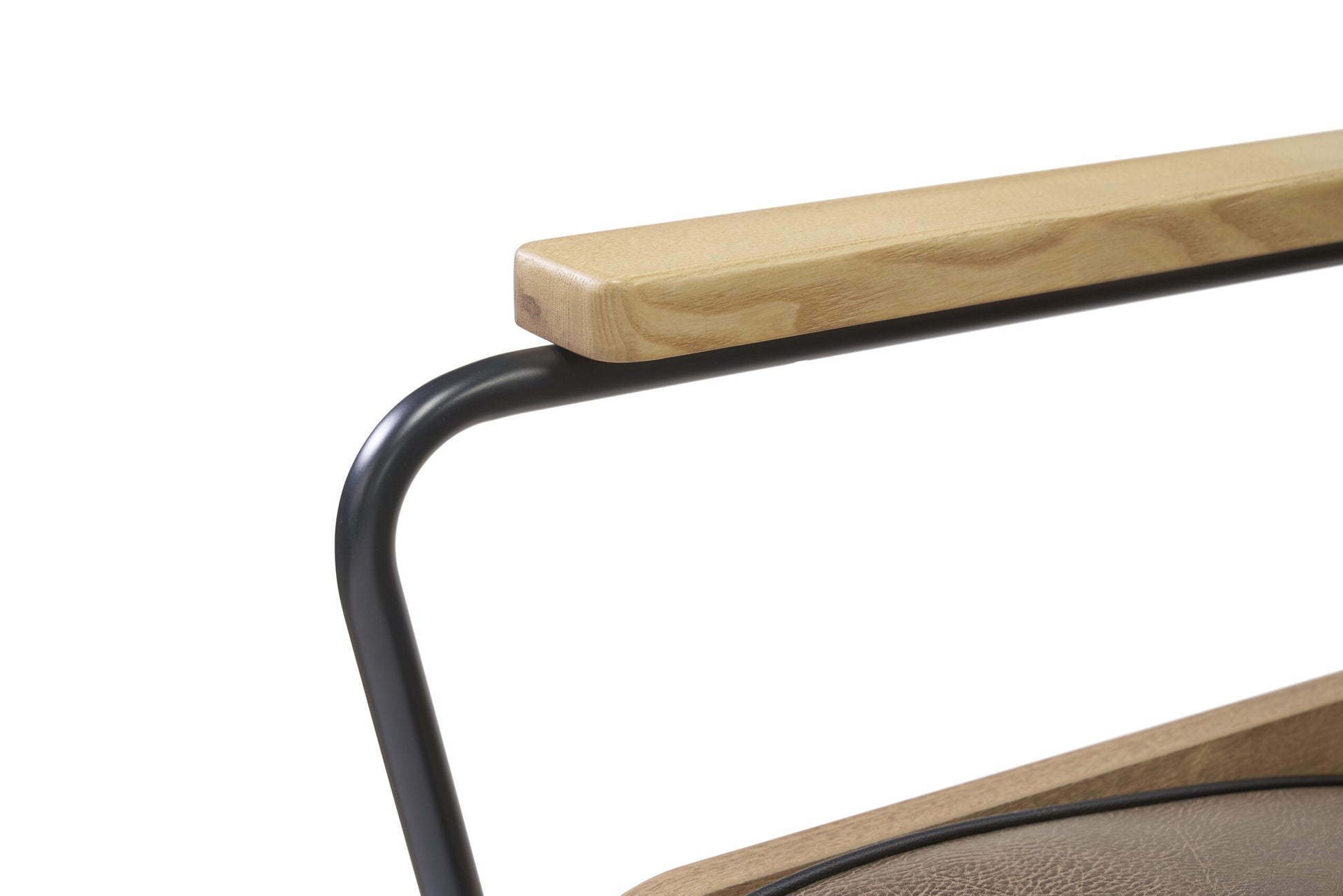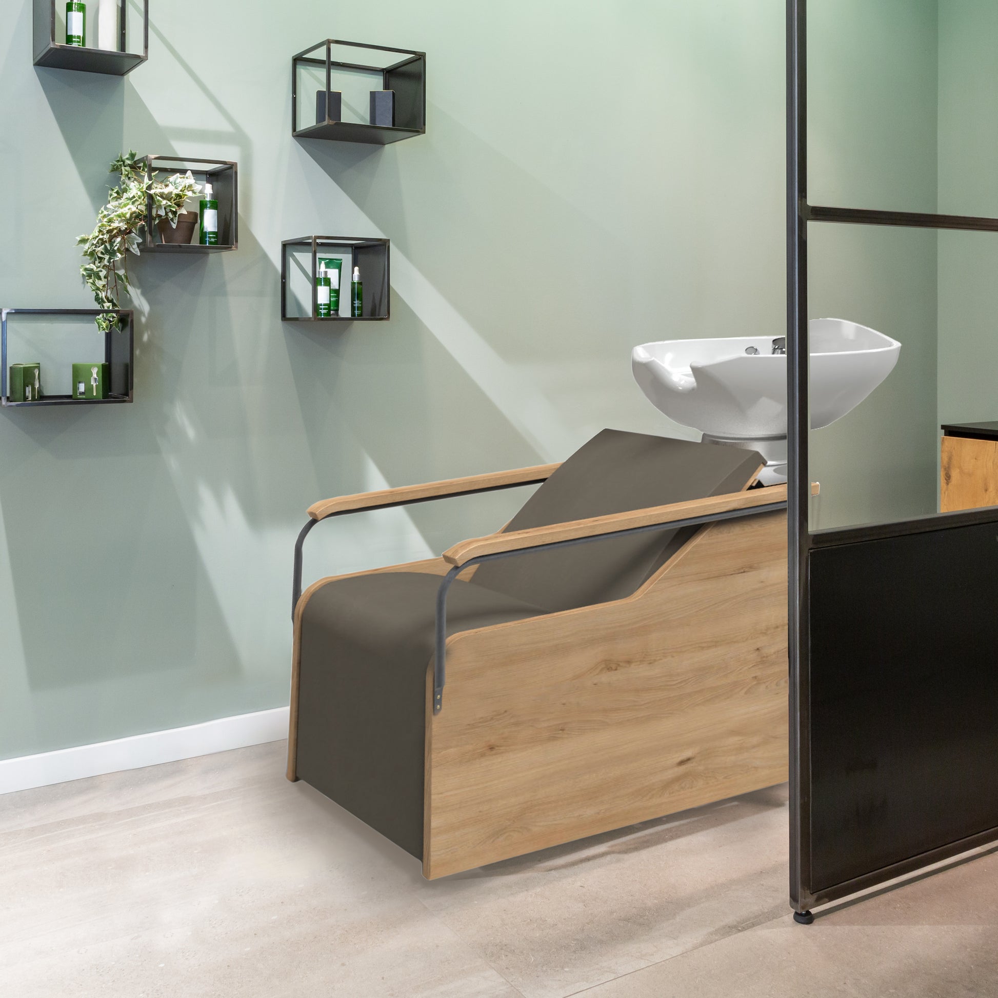 Wash Unit with structure in anti-corrosion cataphoresis treated steel. Seat in plywood with padding in polyurethane foam covered in skay. Armrests in solid varnished oak, and side in oak melamine. Rear casing in painted steel.