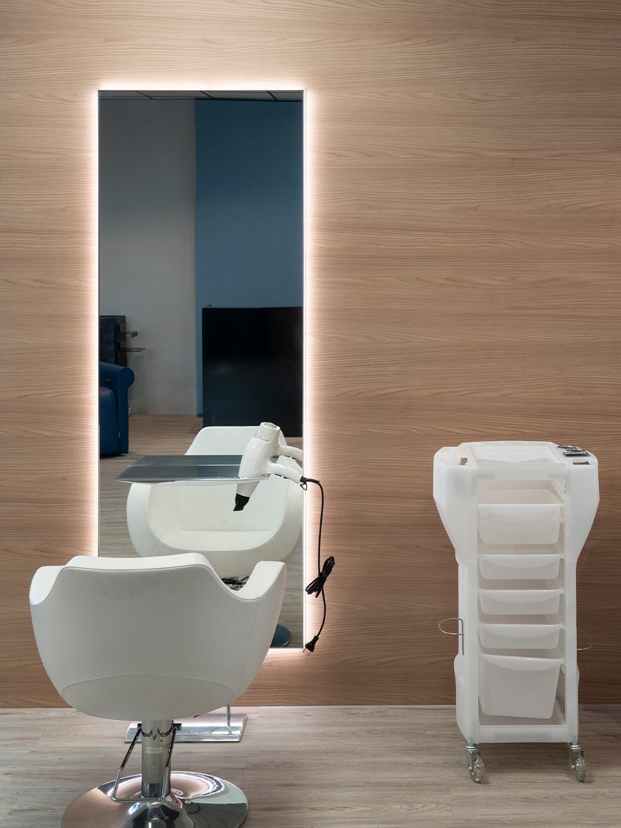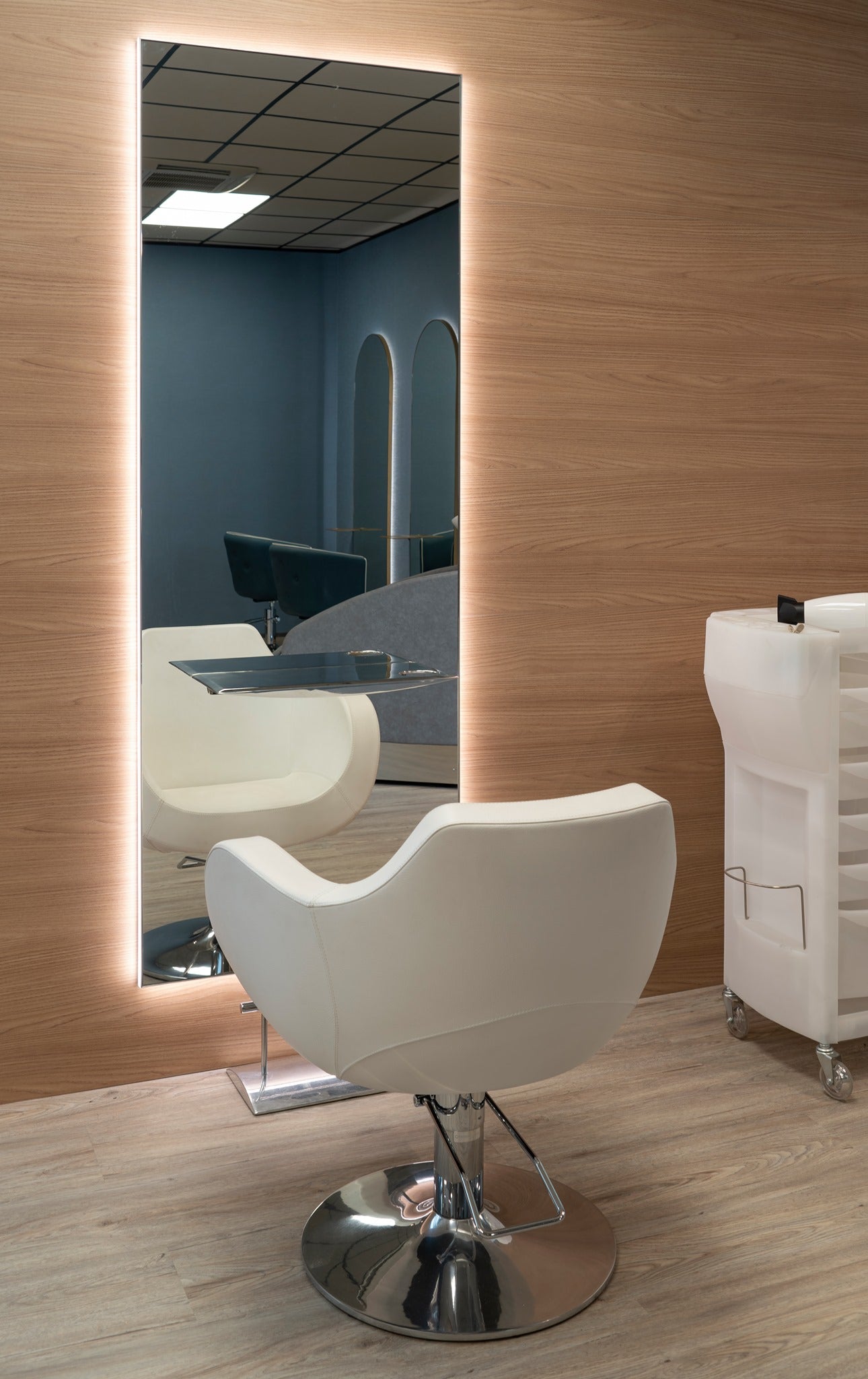 LED New is a salon work station mirror that proposes a contemporary, understated look. Its versatile aesthetic allows it to complement all styles of furnishings and seats, with unflappable elegance.