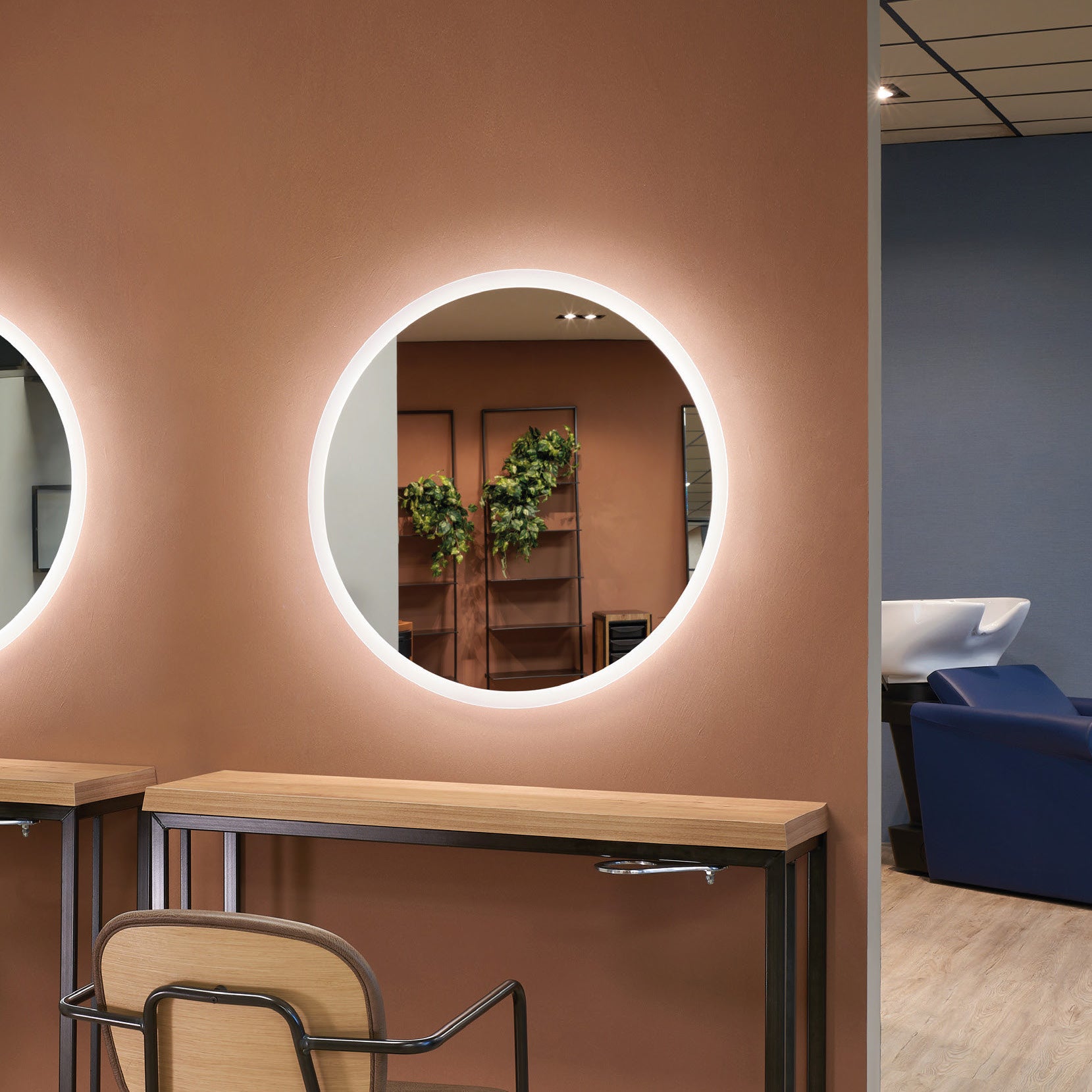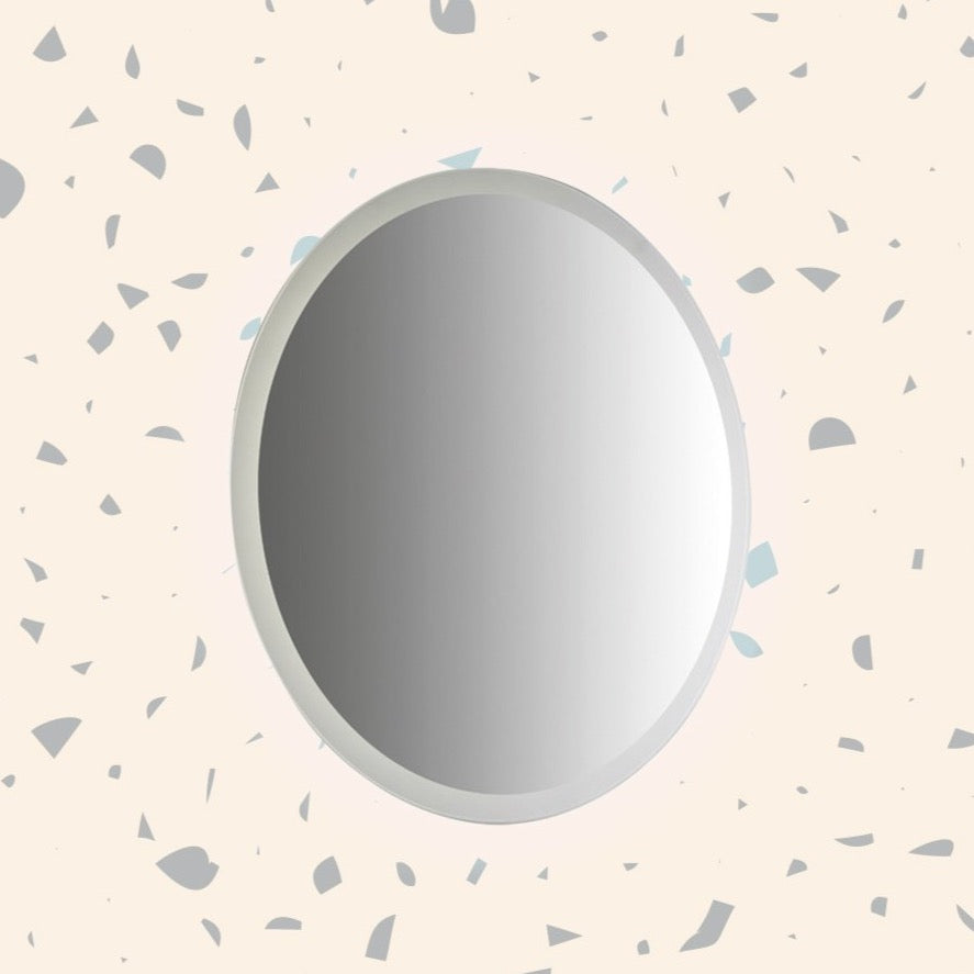 Single wall round mirror with perimeter sandblasting and LED illumination.